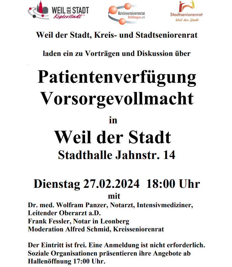 27.2.2024 – Veranstaltung in Weil der Stadt – Vorsorgevollmacht & Patientenverfügung Beitrag veröffentlicht:5. Februar 2024 Beitrags-Kategorie:Aktuelles Das könnte dir auch gefallen 35. Schreibwettbewerb – Einen Versuch war’s wert ……Leseheft jetzt auch ‚online verfügbar‘ 5. Dezember 2024 Einladung zum 34. Schreibwettbewerb des Kreisseniorenrates Böblingen 1. Dezember 2022 Informationen zu Vorsorgevollmacht und Patientenverfügung (Renningen – 18.10.2024) 18. Oktober 2024
