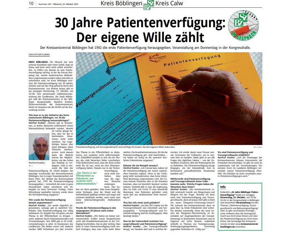 30 Patientenverfügung – Artikel vom 18.10.2023 – SZBZ Beitrag veröffentlicht:23. Oktober 2023 Beitrags-Kategorie:Aktuelles / Presse Das könnte dir auch gefallen Ältere Menschen, die aktiv am sozialen Leben bzw. am Leben in der Gemeinschaft teilnehmen und sich austauschen können, leben gesünder 13. Mai 2024 18. Oktober 2024 (18 Uhr) – Veranstaltung ‚Vorsorgende Verfügungen‘ in Renningen 7. Oktober 2024 Einladung zur Veranstaltung ‚Vorsorgende Verfügungen‘ am 7.11.2025 in Rutesheim 13. Oktober 2025