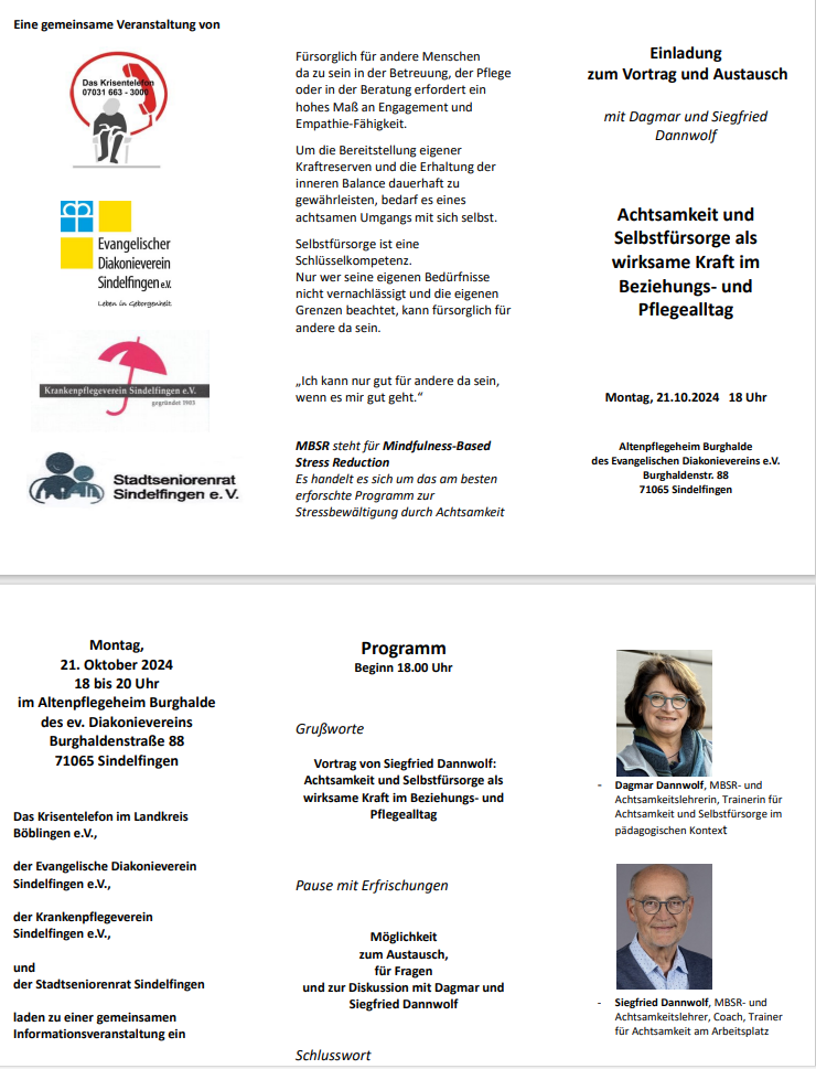 21.Oktober 2024 – Achtsamkeit und Selbstfürsorge für Pflegepersonen Beitrag veröffentlicht:17. Oktober 2024 Beitrags-Kategorie:Aktuelles Veranstaltung in Sindelfingen – 21.10.2924 – 18 Uhr (Altenpflegeheim Burghalde) Das könnte dir auch gefallen ‚Wenn das Leben zur Last wird ‚ – Veranstaltung des Krisentelefons am 20. Oktober 2025 5. Oktober 2025 Übergangsbegleitung – Neue Schulungsreihe für interessierte Neueinsteiger 8. August 2023 Informationen zur Veranstaltung ‚Vorsorgende Verfügungen‘ am 10. April 2025 in Mötzingen 27. März 2025
