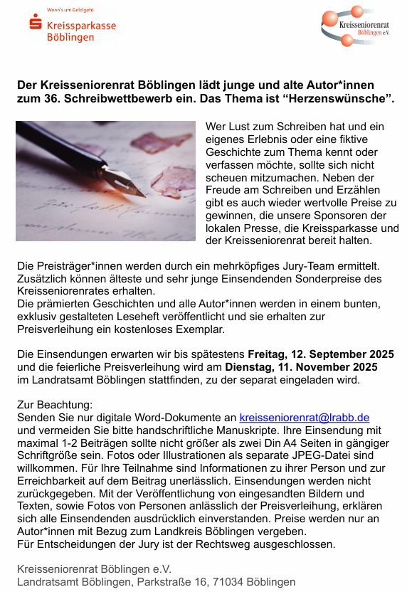 Einladung zum Schreibwettbewerb – ‚Herzenswünsche‘ Beitrag veröffentlicht:3. März 2025 Beitrags-Kategorie:Aktuelles / Schreibwettbewerb / Startseite Das könnte dir auch gefallen Ausstellung ‚Aufgeblüht‘ im Rathaus Aidlingen 13. September 2024 Wertschätzende Kommunikation für Menschen mit Depression und Demenz – Vortrag 16. Juli 2024 im Landratsamt Böblingen 8. Juli 2024 Neuerungen in der Vorsorge & Pflege – 19.9.2024 Deckenpfronn 18. September 2024