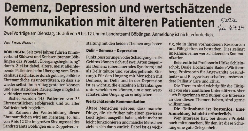 Wertschätzende Kommunikation für Menschen mit Depression und Demenz – Vortrag 16. Juli 2024 im Landratsamt Böblingen Beitrag veröffentlicht:8. Juli 2024 Beitrags-Kategorie:Aktuelles / Presse Das könnte dir auch gefallen Wie fühlt sich Demenz an? 23. September 2024 Veranstaltung zum Thema – Enkeltrick – Herrenberg 21.11.2023 – Spitalkirche 10. November 2023 „Stopp! Mit mir nicht“ – Selbstbehauptung für Senior*innen 5. Februar 2024